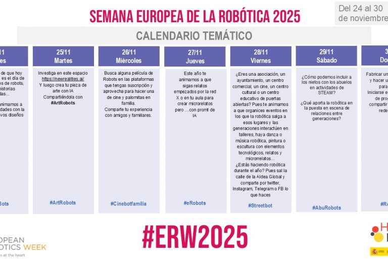 Como cada edición de la Semana Europea de la Robótica, HispaRob lanza su calendario temático de actividades, que abarcará desde el lunes 24 de noviembre hasta el domingo 30. Como es habitual, cada día de la semana estará dedicado a un tema relacionado con la robótica, por lo que os invitaremos a lanzar publicaciones y/o realizar actividades con contenidos que tengan que ver con la temática y que puedan inspirar vuestras acciones. Cada día se propone un reto o temática, acompañado de hashtags que utilizaremos para dinamizar la participación desde redes sociales. 24/11 – Lunes – #ProBots Día dedicado a la creación …