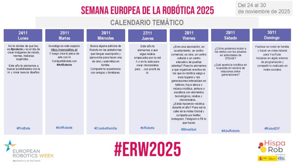 Como es habitual, cada día de la semana estará dedicado a un tema relacionado con la robótica, por lo que os invitaremos a lanzar publicaciones y/o realizar actividades con contenidos que tengan que ver con la temática y que puedan inspirar vuestras acciones.